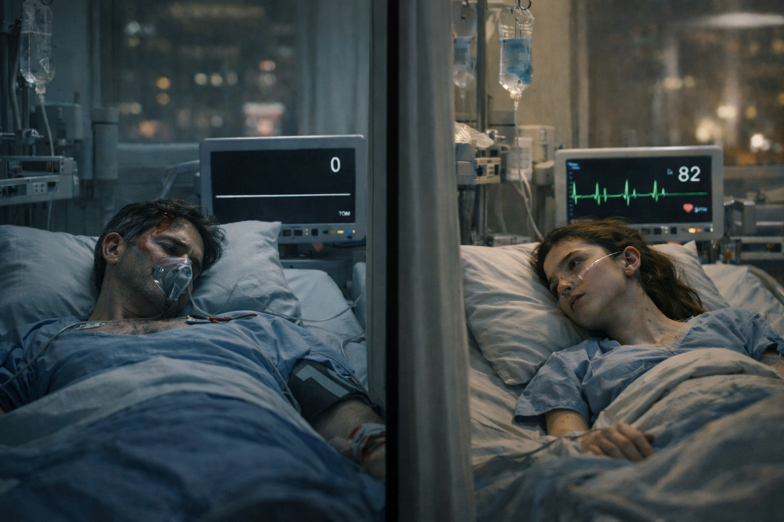 The procedures run in parallel. Intercut between Tom under anesthesia and Olivia receiving his stem cells. In Tom’s mind, memories flicker—family laughter in sunlight, the life he has been trying to protect. In the operating room, his vitals begin to dip. Dr. Lee watches the monitor with professional control and personal grief. In Olivia’s room, the cells begin to take. Her heart rate steadies. Color returns.